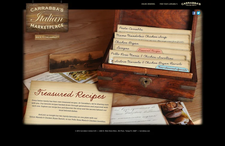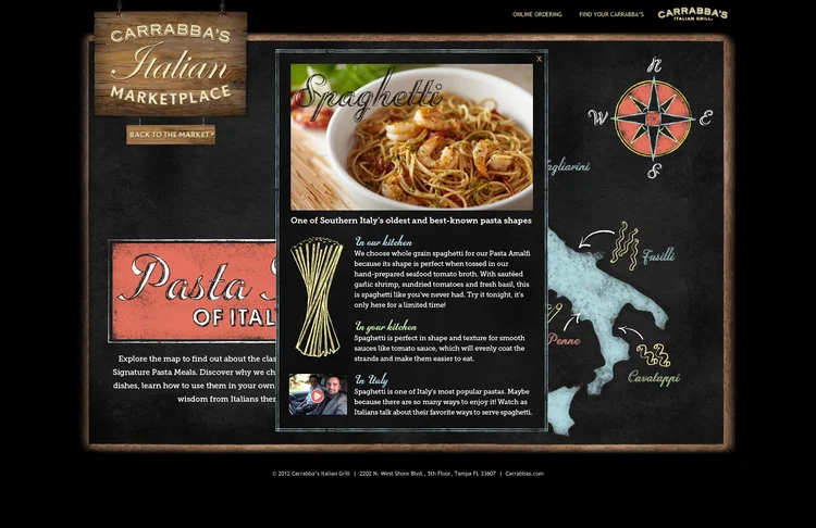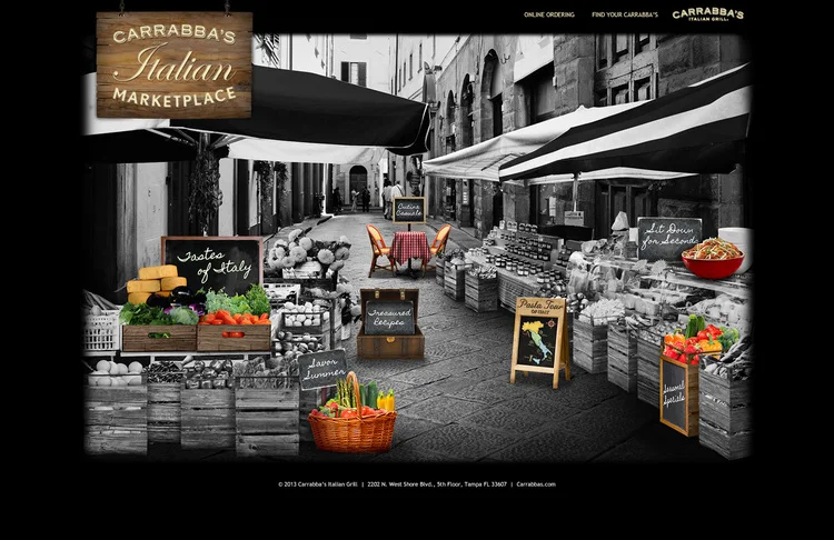 In an attempt to make Carrabba's yearly promotions more cohesive, the Italian Marketplace was born. It consisted of a large photographic collage, where elements could be swapped out quarterly to highlight various dishes and promotions. Larger scale experiences within the Marketplace included quizzes, special offers and video series.