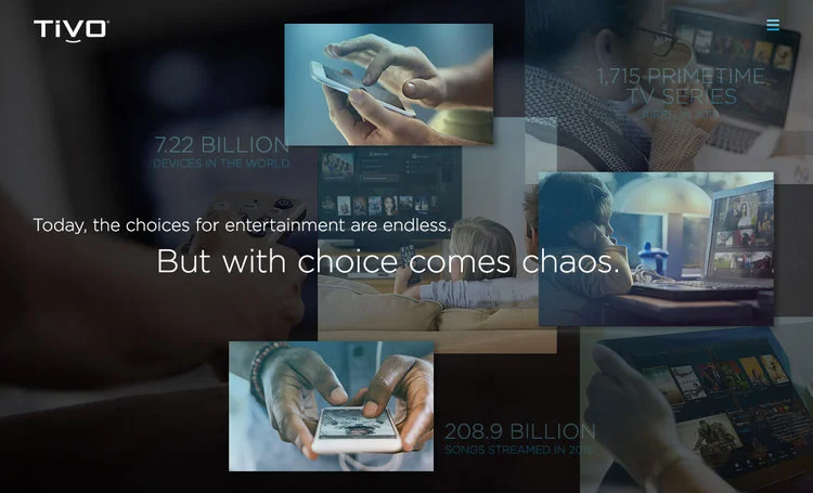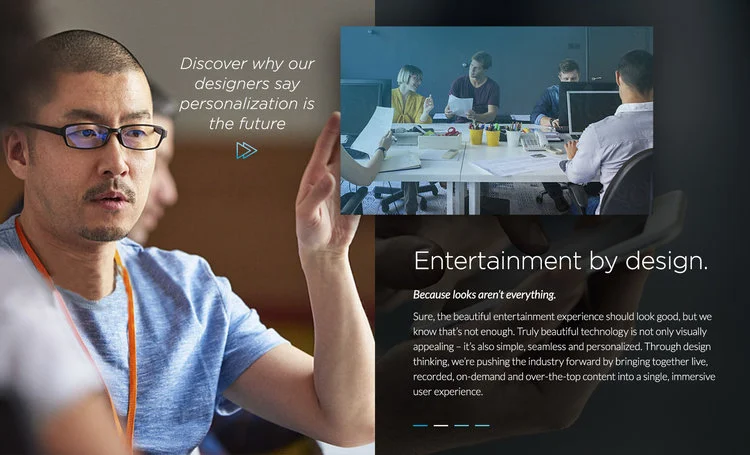 Rovi and TiVo, who have recently merged, wanted to announce their collective vision for the future of their new company. The concept of Forward Faster was arrived at, and the website's intention was to trigger excitement among employees, the media and investors for what's next for the company. To do this, we brought in employees from both companies to share their perspectives on how they are thinking 'forward faster' for their industry. High-octane visuals and fluid design echo the innovative nature of the company.