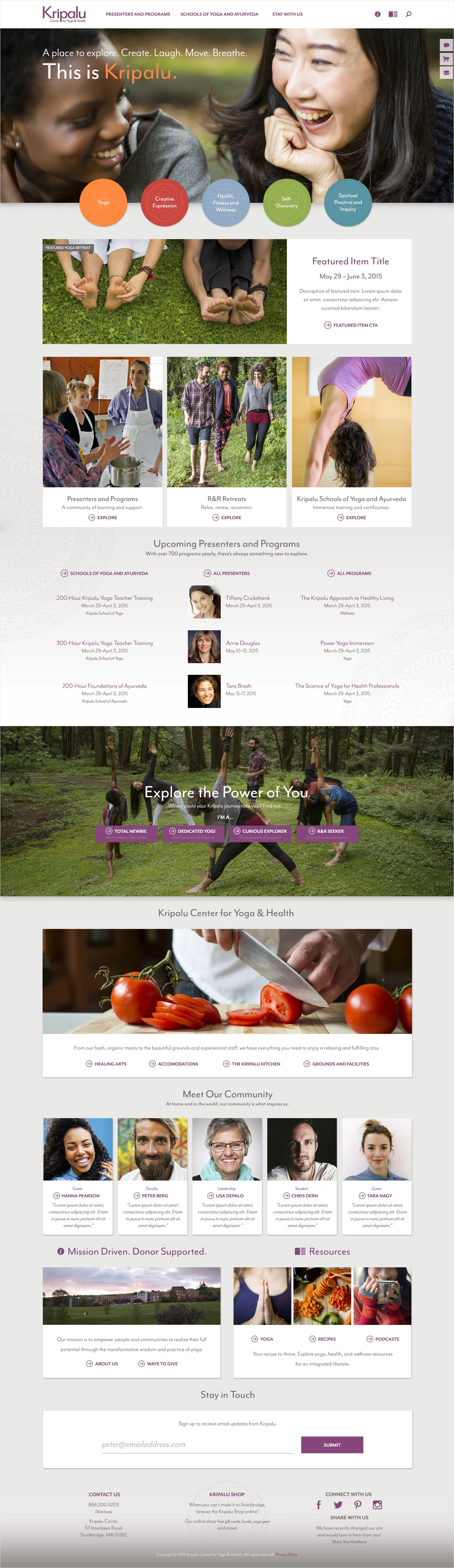 With massive amounts of content and an outdated website, Kripalu was in need of a total site refresh. By working with the lead user-experience designer, I established a visual system that allows users to easily explore and navigate. Bold colors used on the home page establish themes of various programs that are seen across the site. Similar visual elements are used across a variety of pages so that units are easily identifiable as the user browses the site. Large images throughout the site establish the overall feel of Kripalu, with an experiential page allowing users to get an idea of what a day at the retreat would entail.